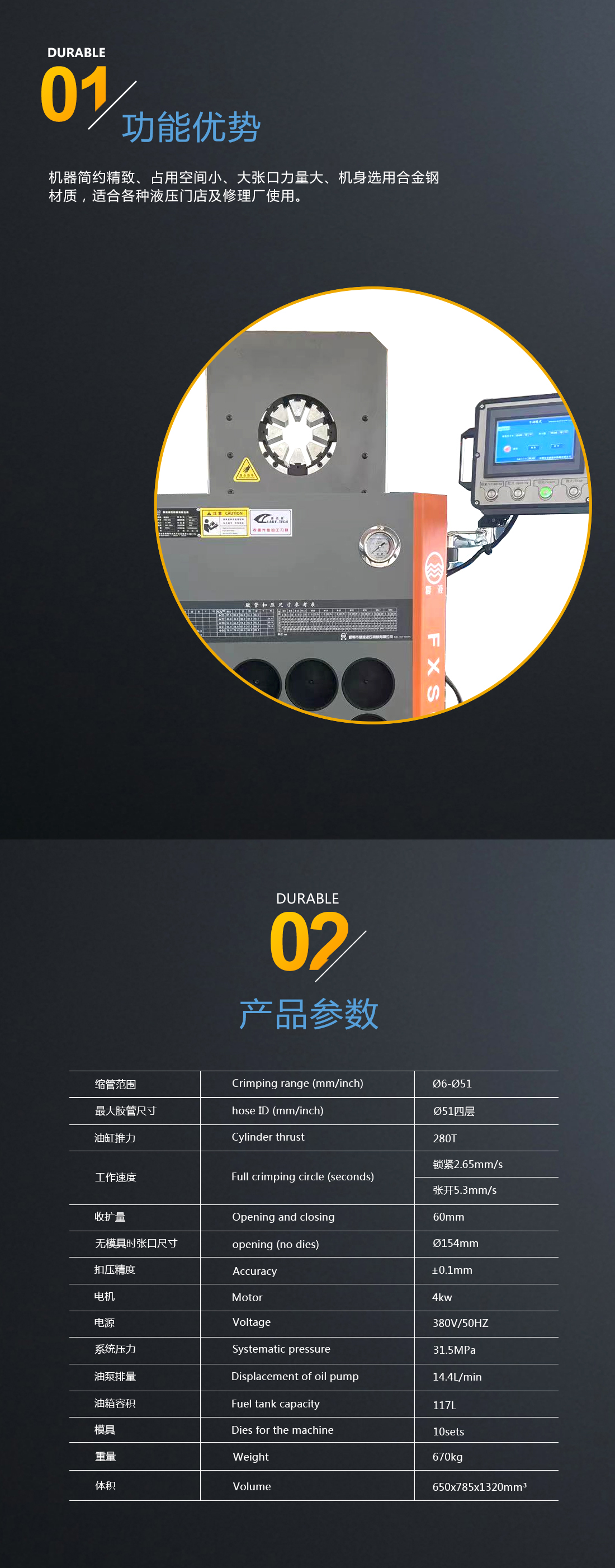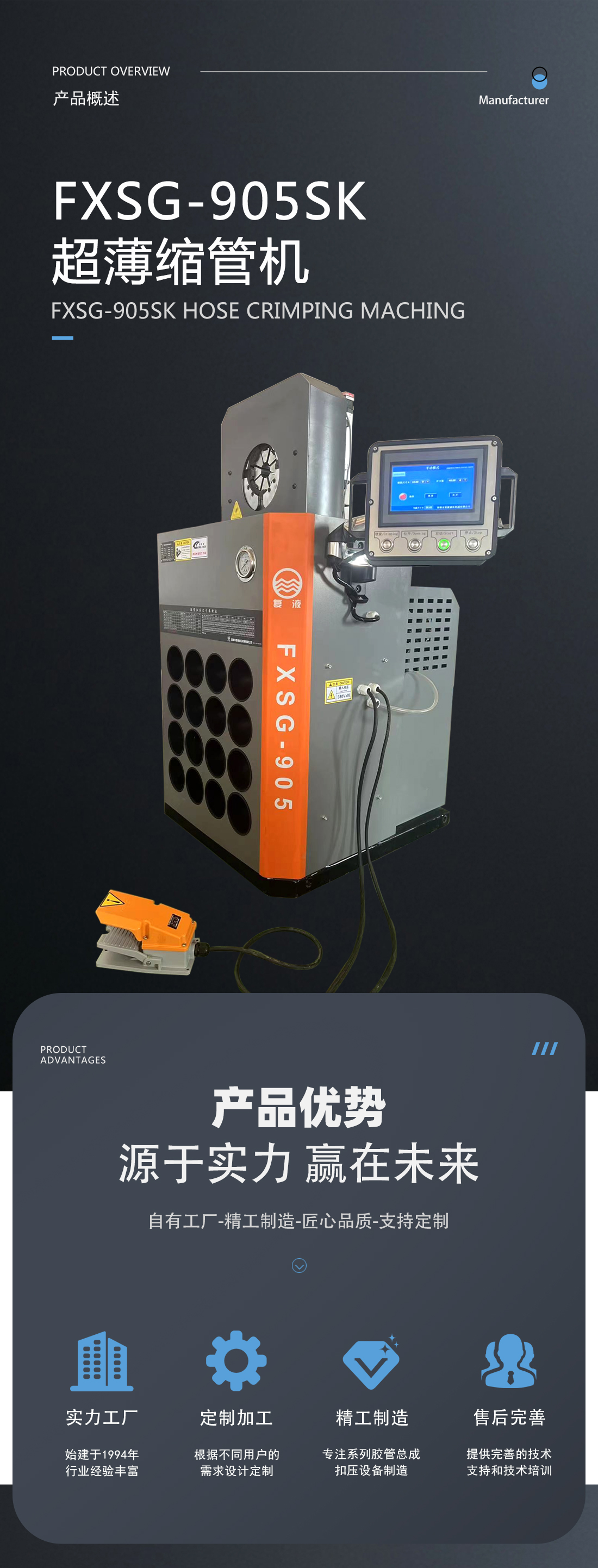 我公司新研發(fā)成功了超薄系列縮管機(jī),扣壓重復(fù)精度可達(dá)到0.1mm。超薄的結(jié)構(gòu)形式克服了傳統(tǒng)環(huán)形扣壓機(jī)固有的不足,能夠非常方便的扣壓形狀復(fù)雜的高壓油管總成和異型軟軸軟管。此款機(jī)器外觀尺寸更小,采用人性化設(shè)計(jì),更方便使用者操作。控制系統(tǒng)采用的是PLC+觸摸屏模式,位移傳感器采集信號精度高,系統(tǒng)可采用手動(dòng)、半自動(dòng)和全自動(dòng)三種模式,用戶可根據(jù)實(shí)際加工的工況非常方便的進(jìn)行選擇,從而大大提高加工效率。在您使用的過程中如遇到有不方便之處請及時(shí)與我們聯(lián)系,我們將以不懈的努力提高您的產(chǎn)品質(zhì)量和工作效率。
